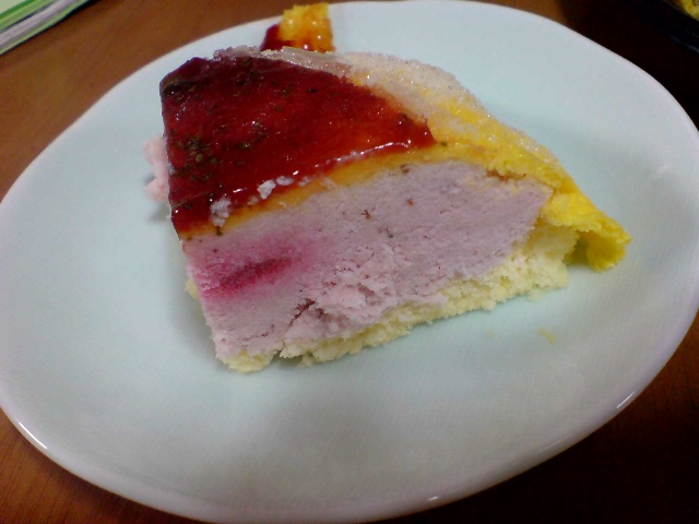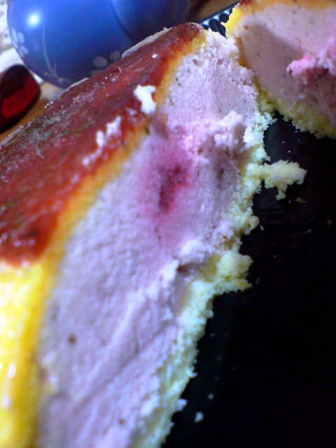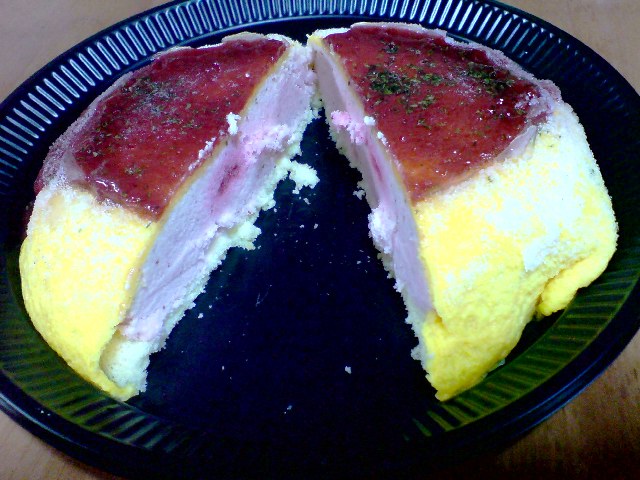 じゃな、中身が気になりますよね。『ケーキ入刀』しました。 アイスみたいですね。そう、中は、ひんやりイチゴのアイスクリームなの。 せっかくなので、食べちゃいます マミィと二人で半分食べたらいいなぁと思っていたけど、ペロッと全部平らげてしましました。 満足満足