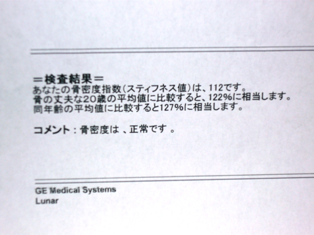 。何年か前にも日曜と言うこともあって、結構な人がいて、会場はちょっと暑かったです。前回もだけど、展示されている標本?を見ると、人間の体ってすごいなぁと思います。 にゃん子は、自分が一度、頭をパカッと開けているので、脳の辺りは非常に興味がありますねぇ~。 また、胎児の成長過程の標本もあり、これはうちの学生たちに見せてやりたいと思いましたねぇ~。 さて、この『人体の不思議展』で思い白いものを見つけました。『あなたの骨密度を測ります』というもの。 にゃん子自身、「骨密度」なんて測ったことがなかったので、測ってみようと思いました。 そしたら、この骨密度となんと、『脳年齢』も一緒に測ってくれるというんです。こんなのにゃん子は大好き ![]() 測定の仕方は、いたって簡単で、骨密度は、右足で測定。靴と靴下を脱いで、器械に脚を乗せるだけ。 脳年齢は、パソコンの画面に出てくる数字を1から順に25までタッチしていくというもの。 そ、そ、そ、そして、結果はと言うと・・・・・・ ![]() ![]() ![]() ![]() ![]() ![]() ![]() ![]() ![]() ![]() ![]() ![]() ![]() ![]() ![]() ![]() まぁ、にゃん子はまだ35歳やから、骨の中がスカスカってことはまずないけど、健康状態GOODでした ![]() でも歳取ると、どんどん減っていくやろうなぁ・・・・ そして、脳年齢の方はと言うと・・・・・・ ジャジャン~♪ ![]() ![]() ![]() 脳年齢 は、 26歳 やってぇ~![]() かなり嬉しいにゃん子。まぁ、こんなんだけで、脳年齢って測れないってわかってるけど、かなり嬉しい。 自分でも単純やなぁと思いつつも素直に喜ぶにゃん子なのです。 興味がある方は、ぜひ、『人体の不思議展』に行って見てください。 面白いですよ。 PR