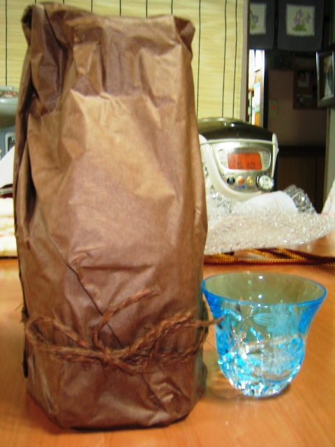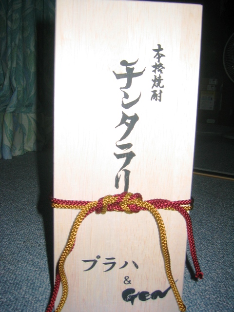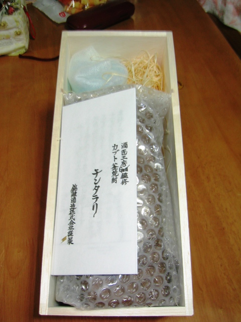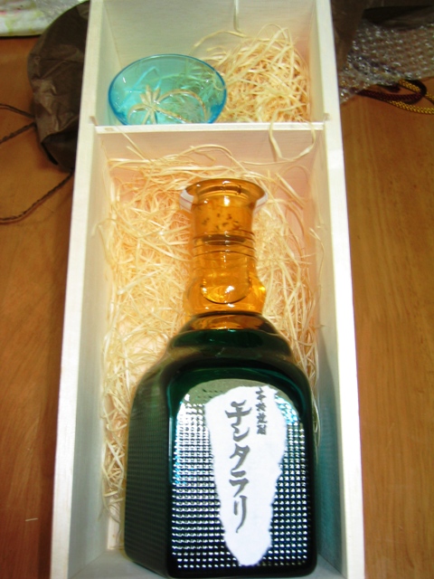 ホントは、その時に持って帰りたかったのですが、名前の通り、製造するのに、非常に時間がかかるらしく『チンタラ、チンタラ』としか出ないんだそうです。よって、後日発送していただくことにしました。 それが先日、やっと届きました。ワクワクしながらあけてみました。 箱に入っていて、ちょっとだけ、高級感があります。 中身はどんな感じなんでしょうか・・・・ すごく、おしゃれなボトルに入っています。 お味の方は、口に入れると初め甘く、そして、辛さを感じ、そして、また、まろやかさが口いっぱいに広がる感じです。 かなり飲みやすい焼酎です。 今、毎晩飲んでます。危険、危険。 でも、これを飲んでいると「塩辛」とか「漬物」とか何かほしくなってしまいます。美味しい「塩辛」なんかがあると、ちびちび飲めそうです(苦笑)