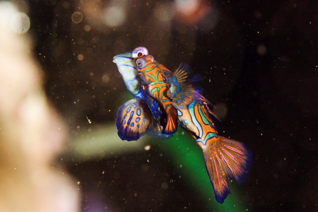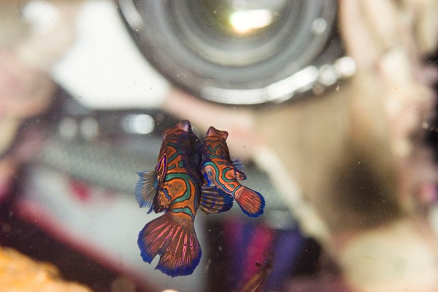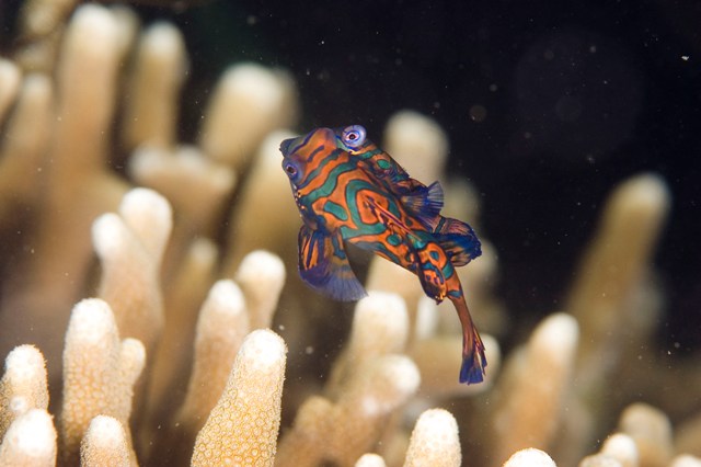 さぁ、3日目、マンダリンリベンジ!!! マンダリンに行ったのは、necomedacaだけ。 ポイントにつくと、ボートもなかったので、「もしかして、貸切?!」とウキウキ!(^^)! ガイドのハニーとマンダリンがいる枝サンゴの根に行ってみると、びっくり仰天。 すべての根にダイバーが所せましと群れていて、ガックシ((+_+)) あぁぁ、ショックゥ~って思っていたら、心やさしいガイドさんがいて、場所を譲ってくれました。 なんてラッキーなんだ(^^♪ そして、待つこと10分。カップリングのはじまり始まりぃ~。 そうそれくらい、沢山のダイバーがいて、みんなカメラ持っていて、パシャー!!!パシャー!!!ってすごいんです。 きっ、「ムードぶち壊しやん!!!(;一_一)」って思っているかもしれませんね。 マンダリンのペアは大きいのと小さいのが一緒になっています。どちらが♂でどちらが♀でしょうか・・・・・・・・ 正解は、大きい方が♀で、小さい方が♂なのです。って偉そうに書いているnecomedacaですが、今回初めて知りました^_^;へへへ そして、ついにNICE SHOTが撮れました。こちらです。