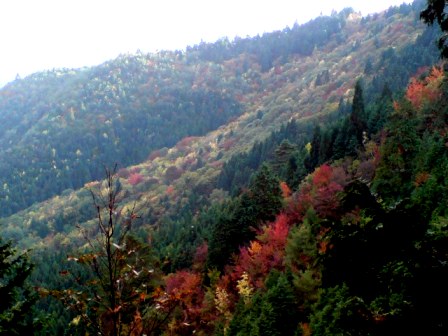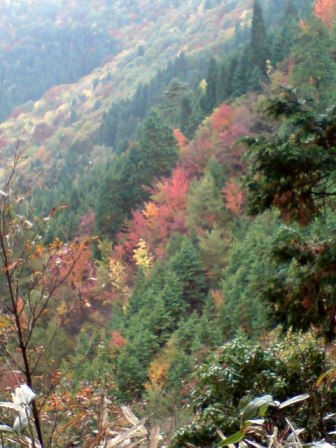 でも、キレイな紅葉が見れたりしてノリノリ。 1時間ほど歩くと、なにやら看板が。 「工事中のため、林道沿いの道を下って下さい」 それも、消えかかったような字で、不安をあおるような看板でした。1時間も下って来たから、また登るのも何やし、看板通り下ることにしました。そしたら、これがまた、ハイキングコースの道とは思えないような道で、山を下ってはいるけど、どんどん山の奥に入っていくような感じでした。 結構あせって来たにゃん子でしたが、「大丈夫」って思ったことがありました。な・な・なんとこの道なき道で、電車の切符を見つけたんです。それも昨日(当日の切符だよ)を見つけたんです。ってことは、誰かが通ったってことやから、絶対大丈夫って、元気になりました。 しばらく歩くと両サイド山で背の高い杉?で覆われた道を歩いていきました。 すると、ガーーーーン。