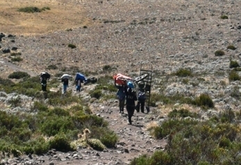 自分が歩み道を分かっているから、気持ちも楽だし、身体も足も楽チン。順調なペースで歩いています 。最初の坂を上りきると目の前に、キリマンジャロの SUMMITがドーーーんと見えます。大きいです。近いように見えるけど、遠いです。雲のもなくスカッと晴れていて、 キリマンジャロに歓迎された気分です 。前回は、雨で全くって言っていいほど頂は見えませんでしたから。 ![]() ちなみに写っている人たちは、東京からの日本人ツアーの方々です。皆さん、結構ご高齢の方ばかりなんですよ。ビックリしました。 そして、ふと後を振り返ると、ポーターさんたちが荷物を運んでいます。なにやら、大きな手押し車を担いで登ってきているみたいです。 こうやって担いだり、頭の上に乗せて運んでくれるんですよ。にゃん子の大きいザックもこうやって運んでくれています。ちなみににゃん子の多きほうのザックは大体12キロくらいの重さです。 ポーターさん、本当にありがとうねぇ~。 そして、さらに進むと、砂漠のようなところに出ます。 わかるでしょうか?細い1本の道が・・・・。既に、ポーターさんや、今朝SUMMITから降りてきた人たちが歩いています。 にゃん子も今から、この道を歩きます。ここからの景色とっても好きです。 このショット、どうしても撮りたかったシーンです。写っているのは、もちろんにゃん子です。お天気も良くて、暑いくらいでした。 今晩、ついにSUMMITに行けると思うとワクワクしてたまりません。 張り切りすぎたのか、KIBO HUTには、な・な・なんと12:15には、着いちゃいました。実は、早くHUTに着きたかった理由があります。 基本的に、HUTにはいくつか部屋があって、その部屋の中には、二段ベッドが12人分くらいあります。にゃん子はどうしても、二段ベッドの下の段をゲットしたかったんです。 なぜか?二段ベッドと言ってもここは外国、めっちゃ高い二段ベッドです。上の段になるとベッドにあがるだけでも大変やし、荷物の上げ下ろしも大変ということもあり下の段が欲しかったのです。 KIBO HUTのレセプションで受付を済ませて、にゃん子のお部屋はRoom#1.と言われました。でも、ガイドのマイコは、4番ににゃん子を連れて行き、「ここだよ」って言います。 にゃん子:「えっ?ここRoom#4やけどいいの?スタッフの人、#1って言ってたと思うけど・・・」 マイコ: 「大丈夫だよ。」 その部屋には、今朝アタックして下山してきた人がまだいて、休憩していたり荷物のパッキングをしたりしていました。 そんな中でにゃん子は下の段のベッドを確保することが出来ました。ラッキー。 そして、にゃん子は、アタック用に服を着替えたり、寝床の準備をしたりしました。 すると、突然、14:00頃、スタッフがドカドカとやって来て、 「早く、パッキングしてこの部屋出てってくれ!!!次に使う人がいるんや」 ってにゃん子まで、追い出されそうになりました。 訳がわからないにゃん子は、いいました。 にゃん子:「はぁ?私、この部屋にいろっていわれたんやけど。」 スタッフ: 「いや、君は、Room#1だ。移動しろ。」 にゃん子:「ちょっと待ってよ。そんなんおかしいやん。マイコ呼んで来て。 ガイドのマイコ呼んで来て。」 スタッフ: 「とにかく、この部屋は使うから荷物まとめて」 にゃん子:「ちょっとそれはないわ。フェアーじゃない。私めっちゃ怒ってるからね。こっちだってちゃんと金払ってきてるんやし・・・」 そこへガイドのマイコ登場 にゃん子:「ねぇ、マイコ。マイコはこの部屋(#4)だって言ったよね?私、確認したよね?#1じゃないの?って。でも、マイコここで大丈夫って言うたやん。」 マイコ: 「とりあえず、#1を見てみよう」 Room#1へ見に行った。にゃん子が到着してから既に2時間が経過。既に、他のゲストが到着しており下の段は占領されていた。 ムカっと来たにゃん子は、マイコに言った。 にゃん子:「私、こっちに移動するのいややで。ベッドの上の段使うのいややから。知ってる?何で、私、ホロンボからキボまでこんなに頑張って歩いたから?ベッドの下の段が欲しかったから、頑張ってあるいたんやで!!! 上の段って私には、高すぎて大変やから、難しいねん。」 マイコ: 「そっかぁ。悪いことしたなぁ。ごめん」 そこへ、さっきのスタッフがやってきて、 スタッフ:「君には、スペシャルルームを用意してあげるから。怒らないで。ちゃんと下の段のベッドを使えるようにしてあげるから。ね。ね。」 そして、ちゃんと下の段のベッドを使える部屋を用意してくれました。 もう、やれやれって感じ。 まぁ、ちゃんと誤ってくれたし、部屋も変えてくれたし、いいことにしようっと。そんなこんなの中、荷物を移動させて、アタックへの準備をしました。 トイレにも行くのですが、ここは、さすが標高4700m。酸素が薄いので、トイレに行って部屋に戻ってくるだけで、息が上がるほどです。 今夜のアタックは、23:30スタート。水を3Lもって行くように言われたけど、2Lにして